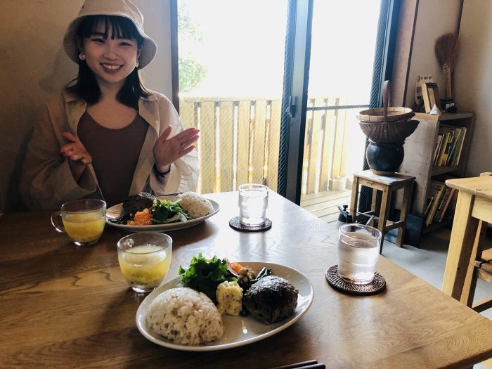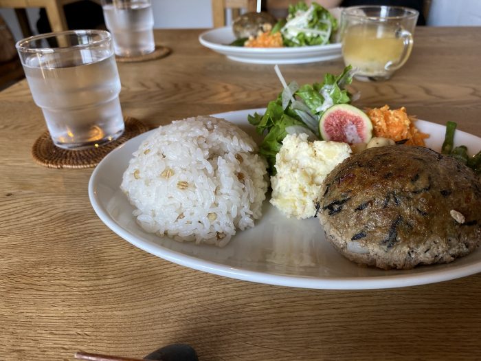 日替わりワンプレートスープ付。この日はひじきと雑穀入りハンバーグがメイン。サラダ、雑穀米入りご飯、ハーブ入り味噌スープと優しい味わい。島育ちの若いいちじくはスライスしてサラダにトッピング。ほんのり甘くプチプチとした食感がアクセントに。