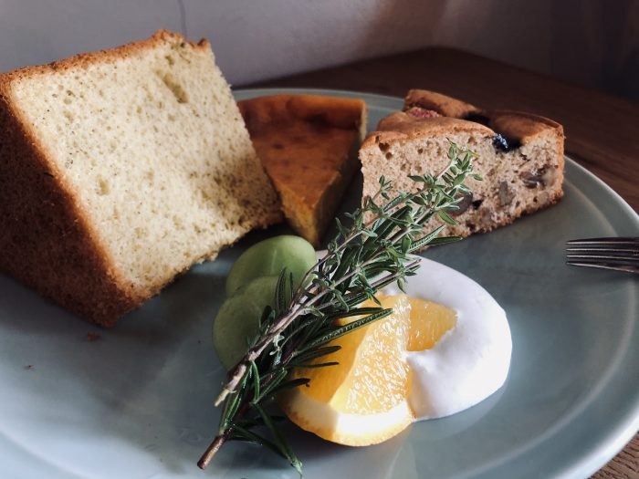 ランチのあと、理恵さん手作りのケーキが目に。選びきれず、シフォン、チーズケーキ、くるみ入りチャイパウンドを盛り合わせ。