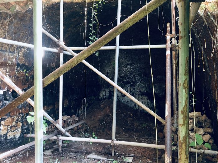 窯跡は草に覆われています。現在、保護のため、中に入ることはできません。今回、特別に許可を頂き、中の様子を取材しました。