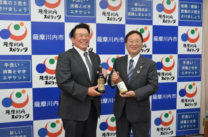 11月17日(火)に市長表敬した、山元酒造とオガタマ酒造の両社の代表を務める山元隆功社長は「愛飲していただいている方に、受賞で恩返しできたと思う」。田中市長は「コロナ禍で、山元酒造とオガタマ酒造の世界的受賞は、一条の光。地元企業発展の引き金であり、朗報」と頬を緩めました。