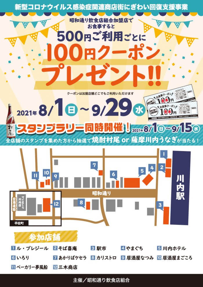 【対象店舗】ル・プレジール、そば喜庵、駅市 薩摩川内、やまぐち、川内ホテル、いろり、あかりばケセラ、カリストロ、居酒屋なつみ、居酒屋まごころ、ベーカリー夢風船、三木商店