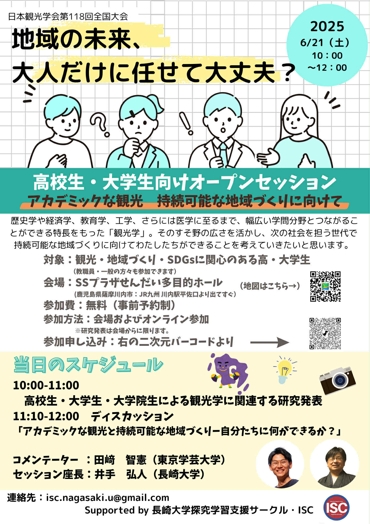 10時から12時までは高校生・大学生向けオープンセッション「アカデミックな観光 持続可能な地域づくりに向けて」が開催されます。一般の方も参加可能(要事前申込)となりますので、ぜひご参加ください。