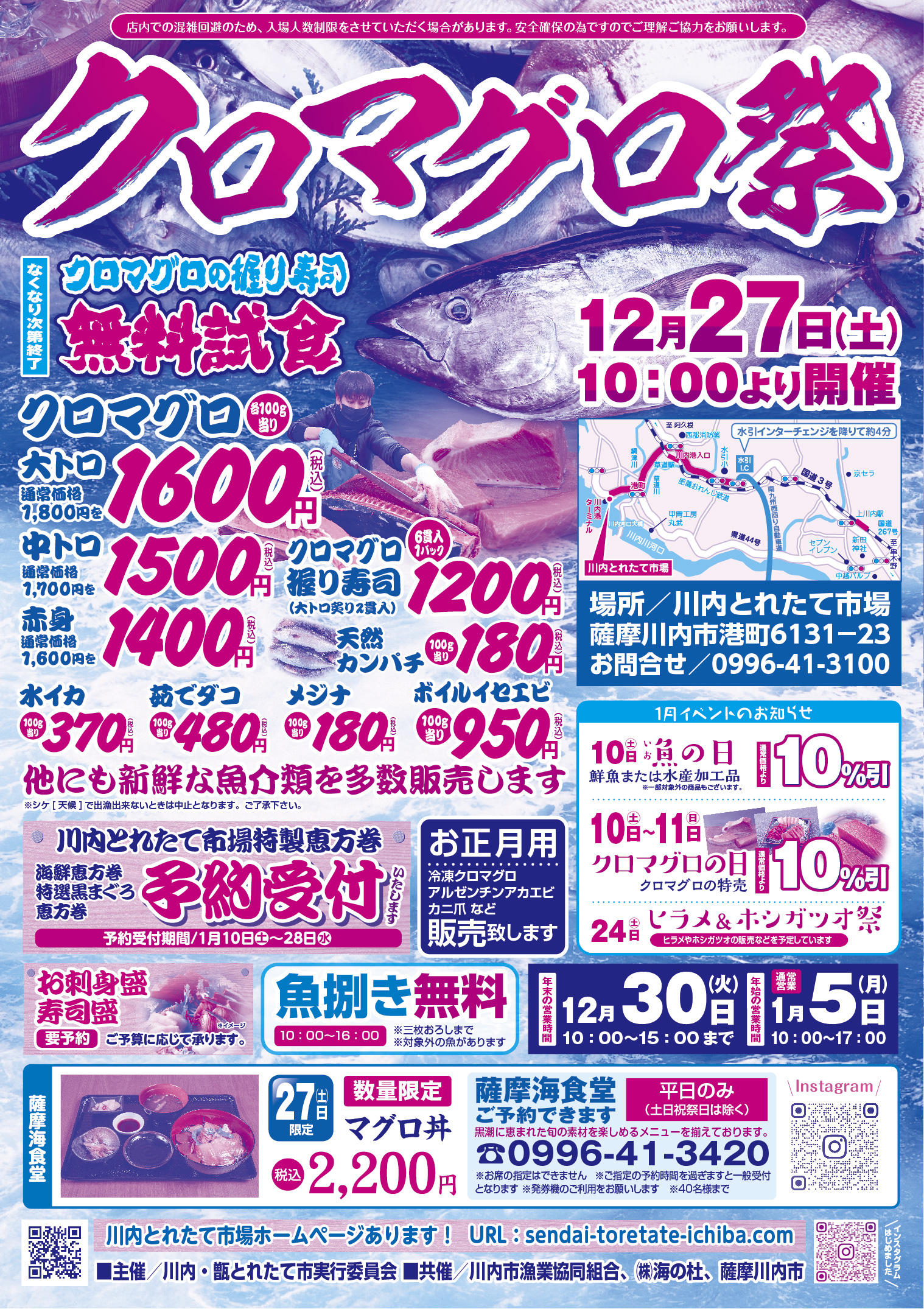 川内とれたて市場では毎月第4土曜日にイベントを行っており、今月27日は「クロマグロ祭」を開催します。