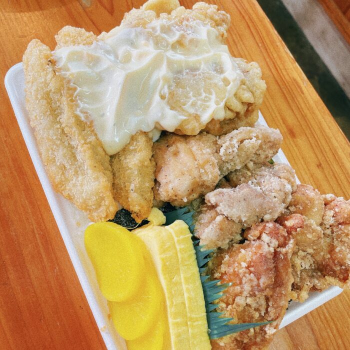 ご飯の量もさることながらおかずの唐揚げが4つ、チキン南蛮が2つ、白身フライが2つと