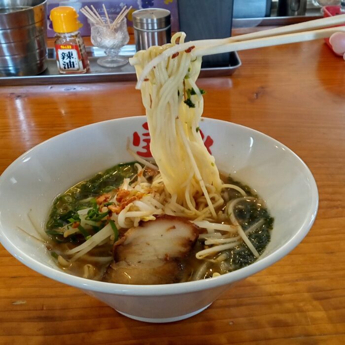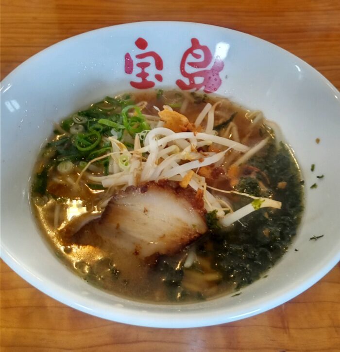 麺は宝島のオリジナルの細麺で、スープとしっかり絡み合い相性抜群。