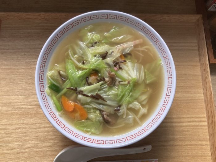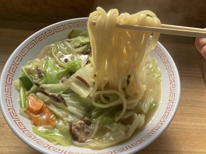 地元で採れた野菜などを使用した栄養たっぷりのちゃんぽんです。それにピッタリのスープは赤鶏の鶏ガラを煮込んでいて、麺に良く絡み旨みたっぷり。
