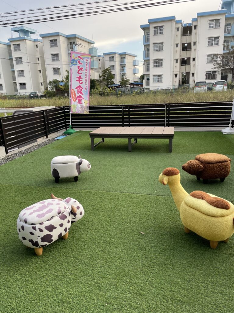 店舗前には人工芝のテラスに動物型の椅子が置いてあり