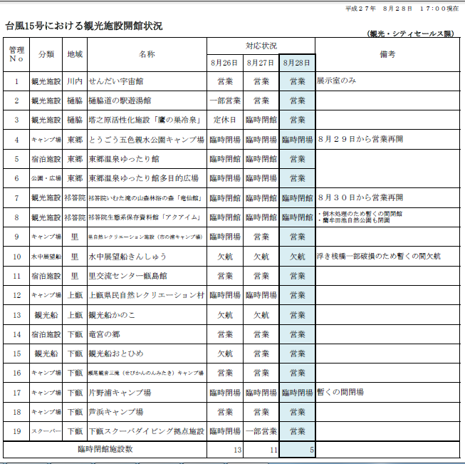 ホーム お知らせ 観光施設開館状況(28日現在) お知らせ 2015.08.28 観光施設開館状況(28日現在) お知らせ 市内の観光施設の開館状況をお知らせします。 この記事をシェアする 前の記事 一覧 次の記事
