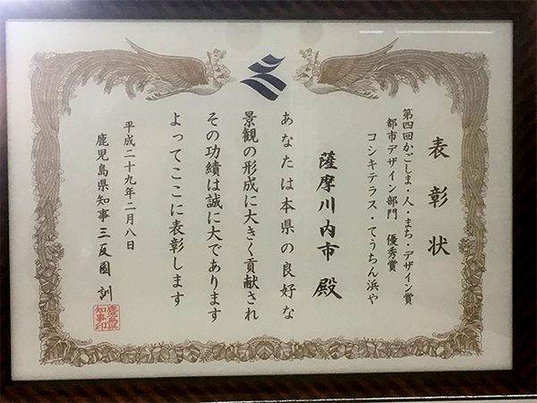 鹿児島県内の良好な景観の形成に功績があった方々を表彰する、「かごしま 人・まち・デザイン賞」に、甑島地域活性化施設の「コシキテラス」と「てうちん浜や」が平成29年2月8日に優秀賞を頂きました。