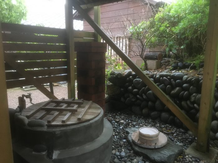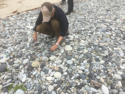 武家屋敷跡の石垣の影響か、スタッフの一人が海岸の玉石で石垣造りにチャレンジ!