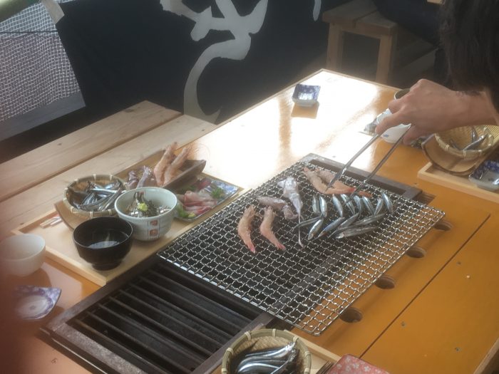 1日目の取材を終えて宿へ。取材陣と我々同行陣で一緒に食事。甑島の焼酎「六代目百合」と甑島名産の「キビナゴ」を塩焼きで!