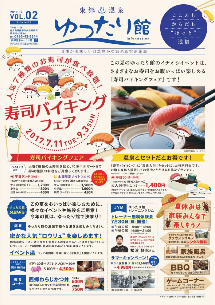 ホーム お知らせ 東郷温泉ゆったり館 寿司バイキ... お知らせ 2017.07.21 東郷温泉ゆったり館 寿司バイキングフェアのご案内♪ お知らせ 7月11日(火)~9月3日(日)に東郷温泉ゆったり館で寿司バイキングフェアを開催されます。 7種類の人気お寿司がなんと食べ放題!! その他にも、和洋中デザートまで全40種類の料理をご用意してお待ちしております♪ また、「お寿司バイキング」に「温泉入浴」をセットにしたプランを特別価格でご提供いたします。 温泉で体を癒し、お寿司でおなかいっぱい満足していただけます!! 皆様のお越しをお待ちしております(^▽^)/ ☆詳しくはこちら☆ この記事をシェアする 前の記事 一覧 次の記事
