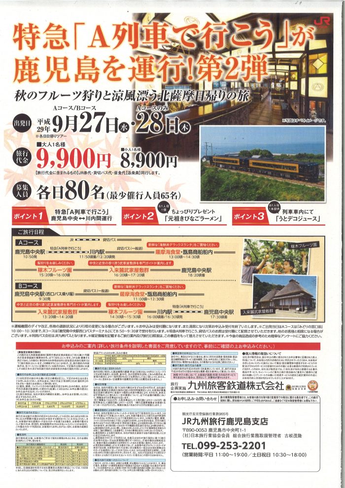 ホーム お知らせ 特急「A列車で行こう」が鹿児島... お知らせ 2017.08.16 特急「A列車で行こう」が鹿児島を運行!第2弾 お知らせ 普段は、熊本~三角間で運行している特急「A列車で行こう」が鹿児島(鹿児島中央~川内)を運行します。 第2弾は秋のフルーツ狩りと涼風漂う北薩摩日帰りの旅として、特急A列車に加え、薩摩海食堂やフルーツ園での梨狩り、県三大武家屋敷群の一つ入来麓武家屋敷群を巡る薩摩川内満載の内容となっています。 特急「A列車で行こう」に乗車する特別感あふれる旅にぜひご参加ください。 お申込み・お問い合わせはJR九州旅行鹿児島支店まで ℡:099-253-2201 この記事をシェアする 前の記事 一覧 次の記事