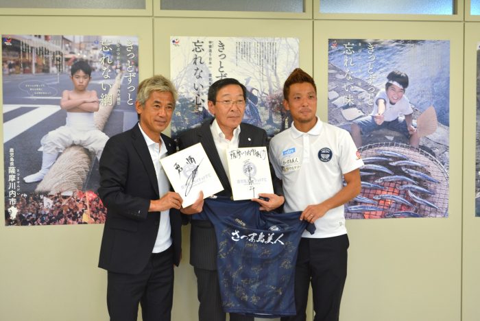 「薩摩川内サンクスデー」の開催に伴い、鹿児島ユナイテッドFCの三浦泰年監督と山田裕也選手(れいめい高校卒)が、薩摩川内市に表敬訪問に来られました。