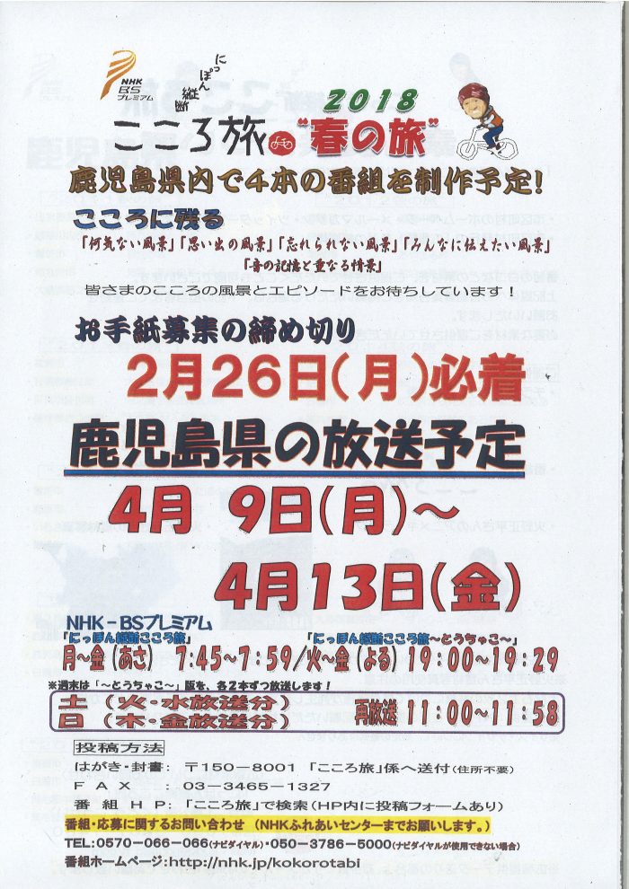 「にっぽん縦断 こころ旅2018 春の旅」 お手紙募集!!