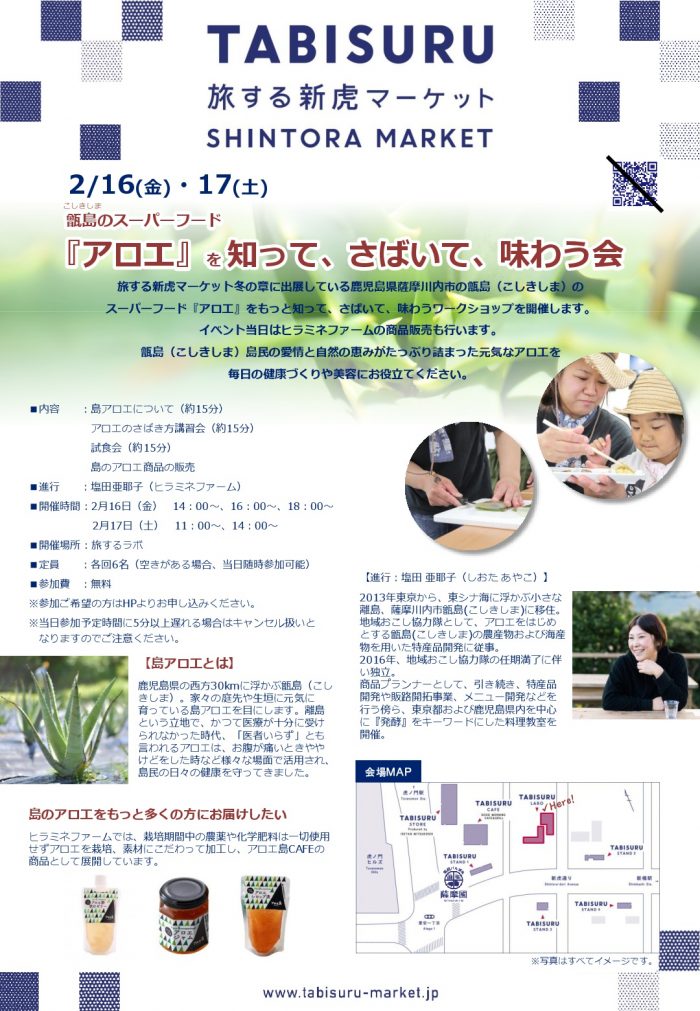 東京都港区西新橋で展開中の「旅する新虎マーケット」で、「甑島のスーパーフード『アロエ』を知って、さばいて、味わう会」が開催されます。