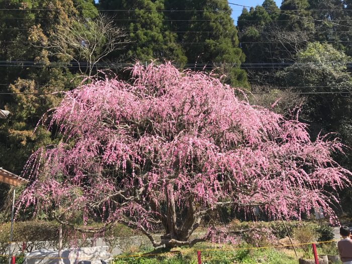 個人のお宅で大切に育てられている枝垂れ梅と、