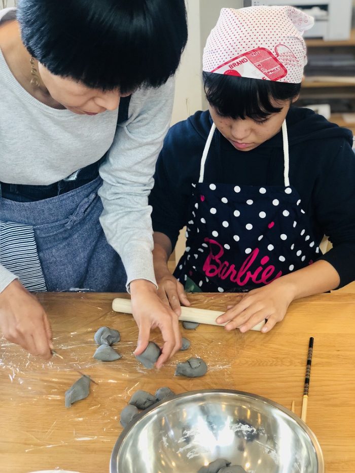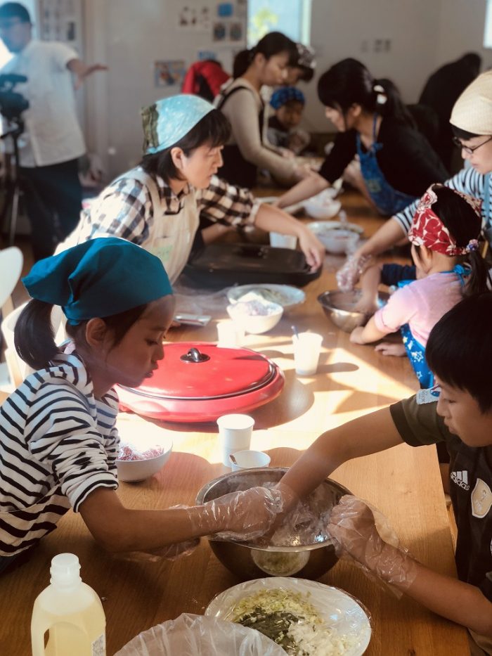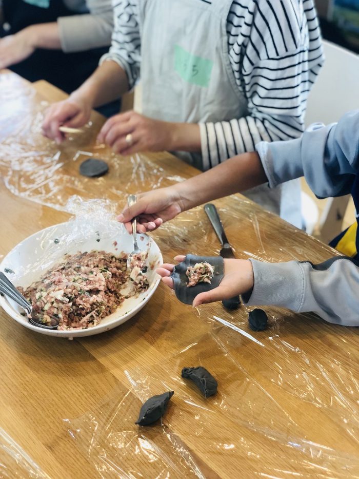 まずは竹炭餃子づくりからレポート開始!竹炭入りはもちろん、皮から餃子をつくるのも初めてというお子さん、親御さんも多かったようです。