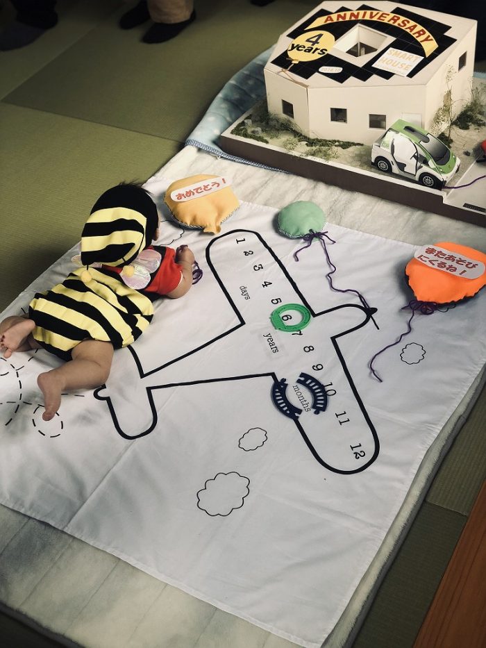 リラックスしたところで、赤ちゃんと「ごろりんアート」。いろんな衣装を着せて、写真撮影。月齢なども残せるので記念になりますね。