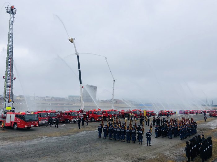消防出初式のクライマックス、一斉放水の準備が整いました!