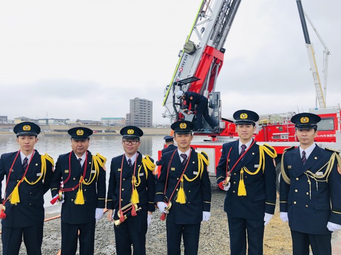 消防局の皆さん。左の方は、はしご演技も披露。初めての演技だった2018年、そして今回と毎年数か月前から練習を重ねてきたそうです。演技を終えてほっとひと息。