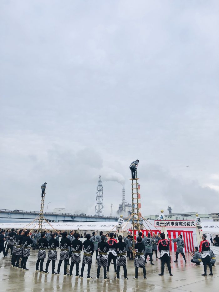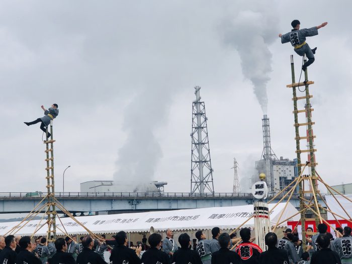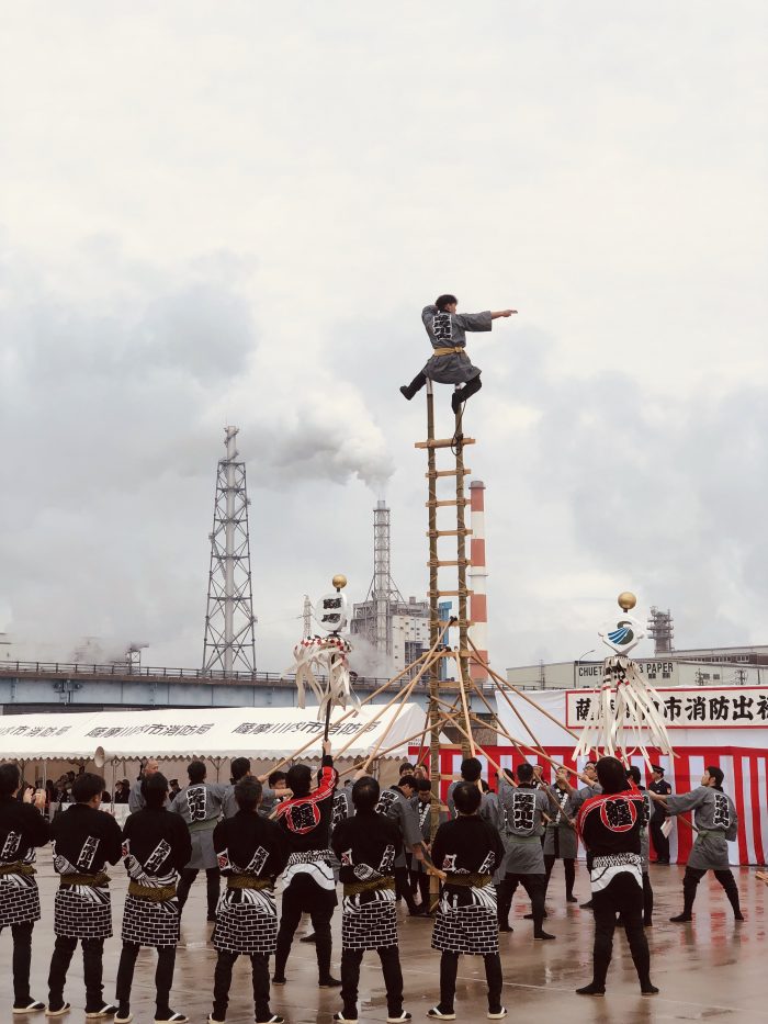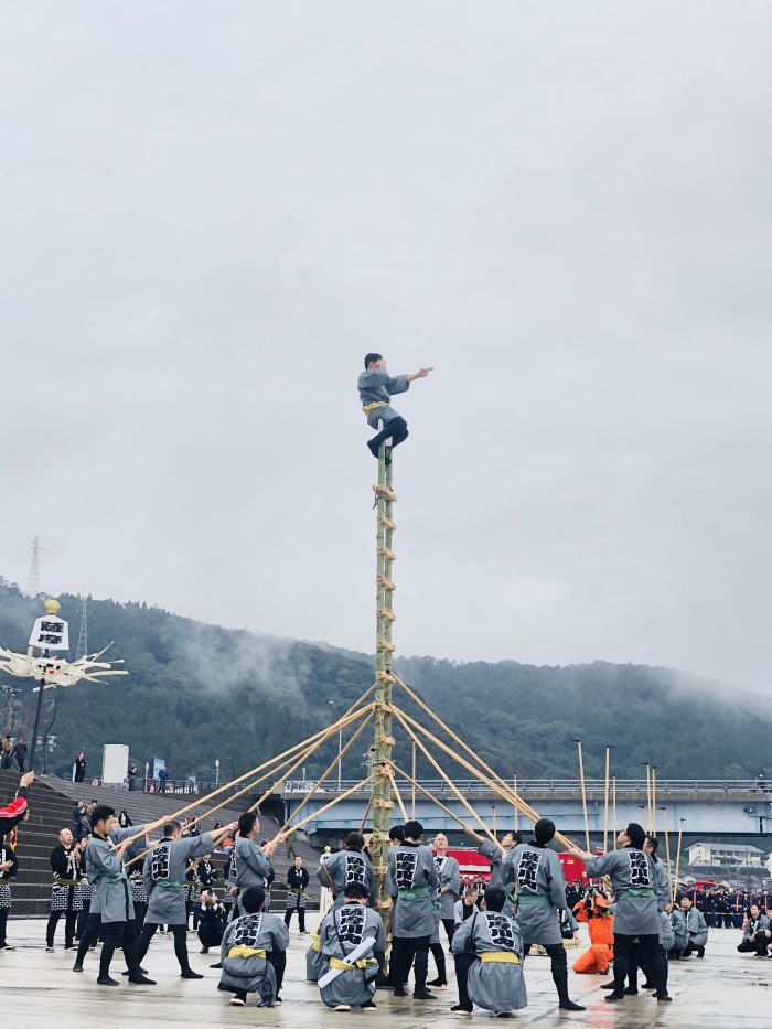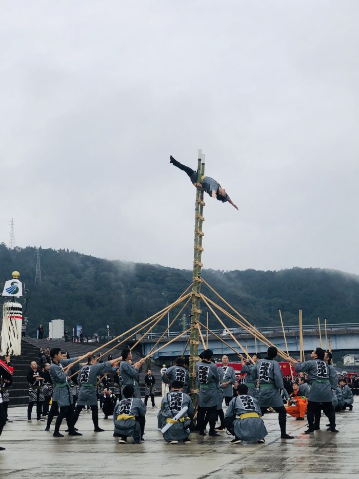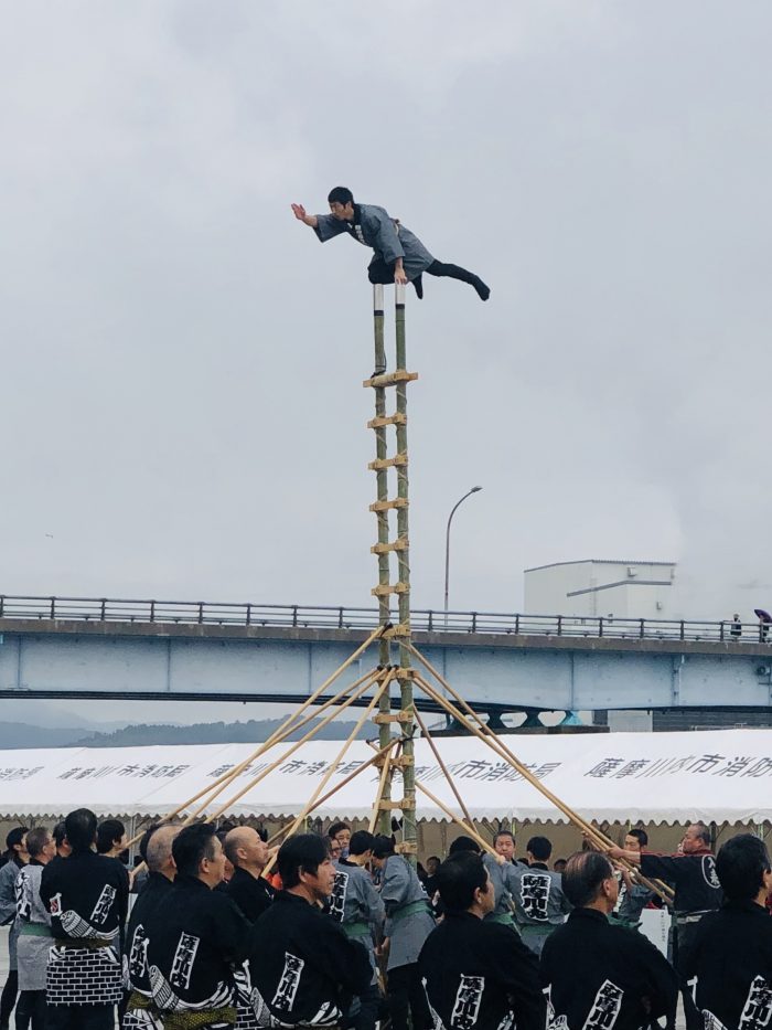 上方、下方と2つの竹はしごで演技は行われます。元は城下町の町火消しを務めるとび職等が、火事の現場を見つける動作や消火活動の技能を示すものとして始められたそう。