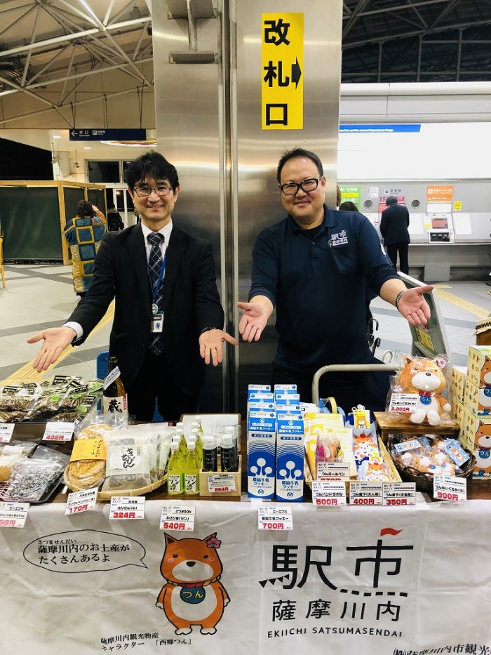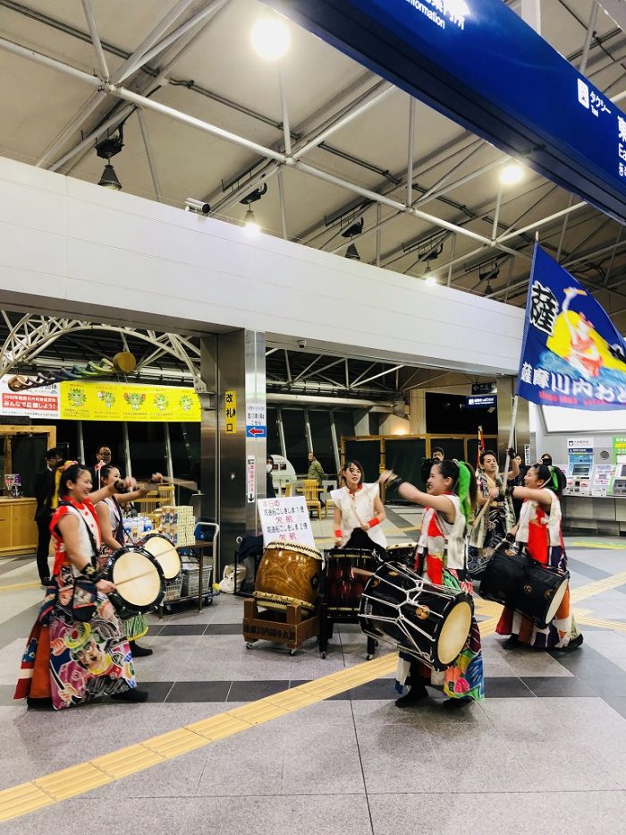 JR川内駅の日野駅長、一日駅長を務めるたけどん(竹原勇輝さん)、鹿児島ご当地アイドルサザンクロスのふたり、薩摩川内市親善大使、薩摩川内踊り太鼓の皆さん