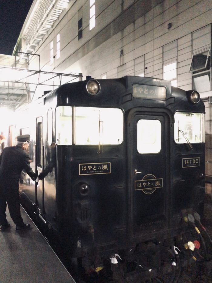 今回特別に用意した特急「はやとの風」!重厚な黒い姿がJR九州の誇る観光列車のなかでも人気の高い列車です。
