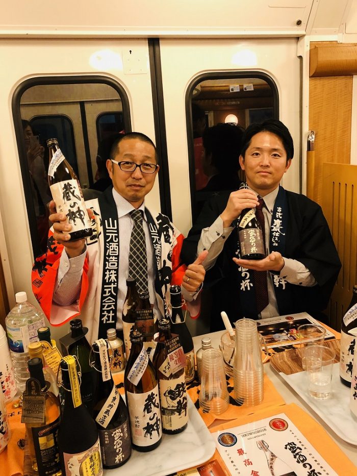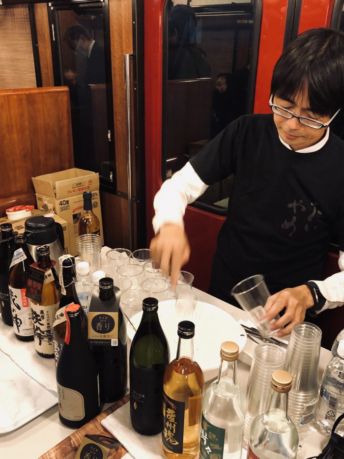 竹どん(竹原勇輝さん写真左)の「焼酎列車、やりたいんですよね」という一言から始まったこの企画。多くの方のご協力があり、初めての運行は大盛況。参加者からは「また乗りたい」「昼間の車窓も楽しみ」「観光客も乗りたいと思う」など、好評だったようです。「まずは地元の皆さんに、この非日常空間を楽しんで欲しい。そして観光客の皆さんに、薩摩川内やいちき串木野の魅力を味わってもらえたら」と語る日野駅長(写真中央)。列車に乗って地元の焼酎を楽しむ。ローカル線の新たな魅力を感じる、よか晩となりました。