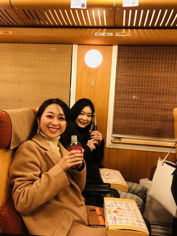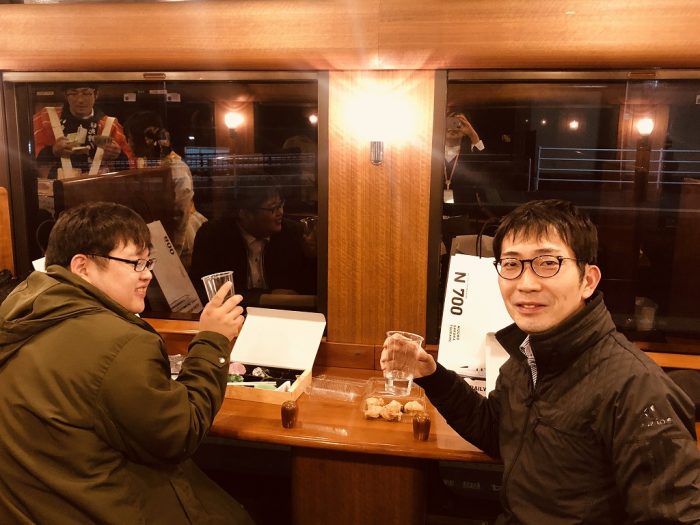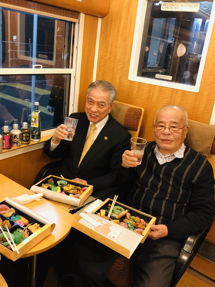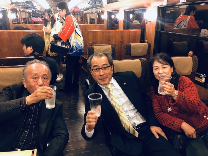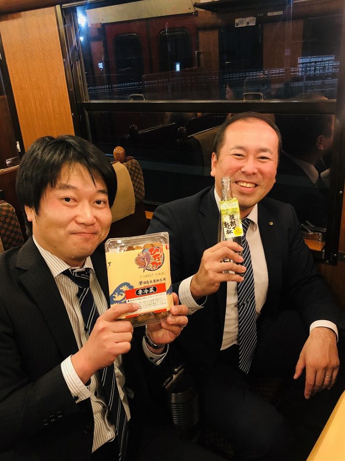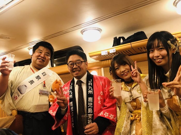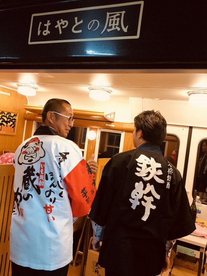 「乗り鉄」さんでもあるというお二人。「はやとの風に乗って、焼酎まで飲めて楽しいです」
