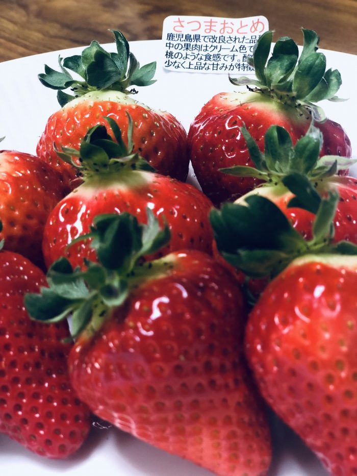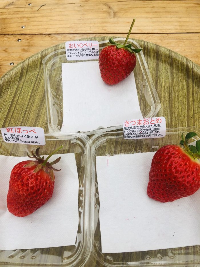 さつまおとめは大粒で甘く、桃のような食感。クリーミーな乳白色の果肉で、食べごたえがあります。酸味が少なく、子どもから大人まで好まれる味わいです。おいCベリーは、色、味が濃くビタミンCとアントシアニンが豊富。果肉も赤いのが特徴です。紅ほっぺは、色・香りが良く、果汁が多いのが特徴。野イチゴのような風味で全国的にも人気がある品種です。ぜひ食べ比べて、品種ごとの味わいの違いを楽しんでみてください!