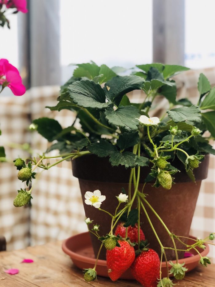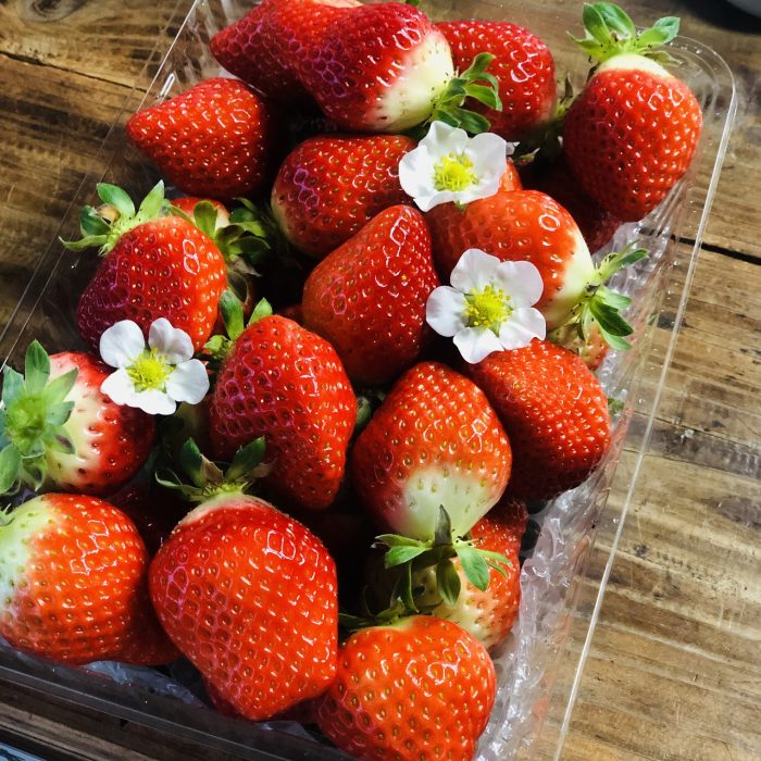 ひがし農園では朝摘みの新鮮ないちごを届けています。いちごの花を添えて。