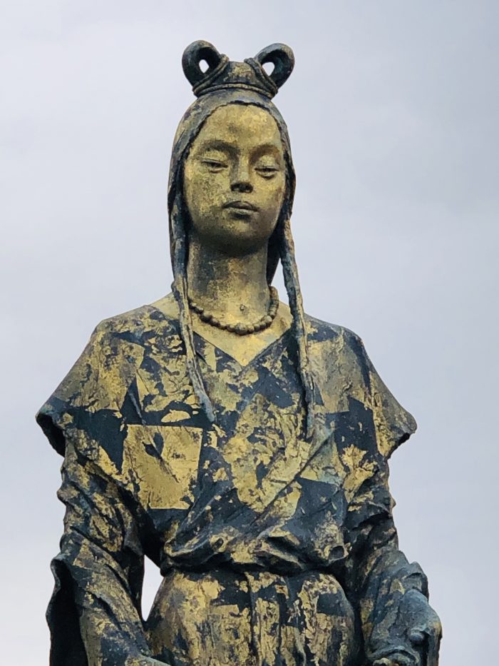 南さつま市金峰町にあるコノハナサクヤヒメ像。ニニギノミコトとコノハナサクヤヒメは現在の南さつま市・笠沙にて出会い、結ばれ、ホノスソリノミコト(海幸彦)、ホスセリノミコト、ヒコホホデミノミコト(山幸彦)の三皇子をもうけました。ニニギノミコトとコノハナサクヤヒメから見て、子・ヒコホホデミノミコト-孫・ウガヤフキアエズノミコト、そしてひ孫が初代・神武天皇となります。