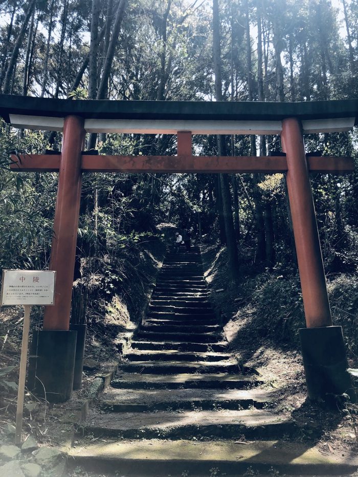 フェンス入り口から左手に進むと「中陵」鳥居があります。苔むす石段を登ります。
