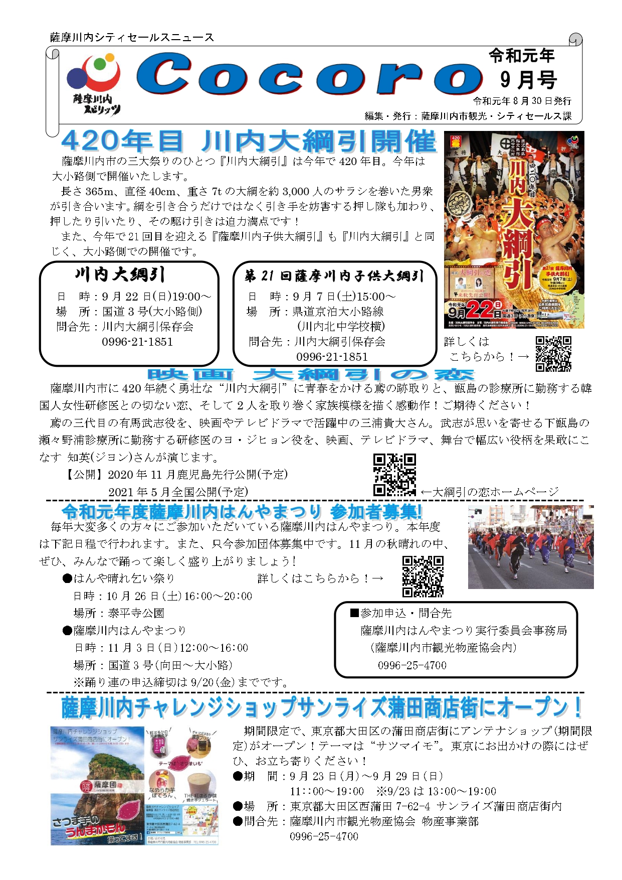 「月刊 薩摩川内シティセールスニュース Cocoro 令和元年9月号」が発行されました。
