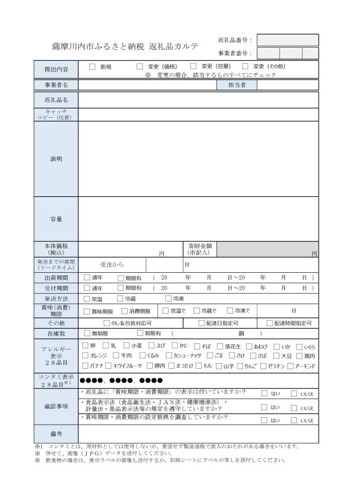 ホーム お知らせ 薩摩川内市ふるさと納税 返礼品... お知らせ 2022.03.11 薩摩川内市ふるさと納税 返礼品協力事業者の登録について(返礼品カルテ様式など関係書類) お知らせ ※ 令和4年(2022年)3月10日 様式変更を行いました。 薩摩川内市ふるさと納税返礼品事業にご登録希望の事業者の方は、必要書類をご提出ください。 ・返礼品事業者登録要項 (PDF) ・ふるさと納税_返礼品本体価格(税込)及び寄付金額一覧 (PDF) ・返礼品協力事業者登録申込書 (Excel・PDF) ・返礼品カルテ (Excel・PDF) ※返礼品ごとに作成してください。画像(JPG)も同時に提出をお願いいたします。 提供資料 ふるさと納税_返礼品事業者登録要項(PDF) PDF (106.3 KB) ふるさと納税_返礼品本体価格(税込)及び寄付金額一覧(PDF) PDF (38.6 KB) ふるさと納税_返礼品協力事業者登録申込書(PDF) PDF (141.2 KB) ふるさと納税_返礼品協力事業者登録申込書(Excel) XLSX (17.3 KB) ふるさと納税_返礼品カルテ様式(PDF) PDF (166.5 KB) ふるさと納税_カルテ様式(Excel) XLSX (47.1 KB) この記事をシェアする 前の記事 一覧 次の記事