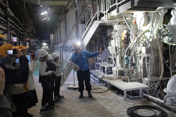 工場内見学では大きな機械に驚いた様子で、真剣に解説に聞き入っていました。