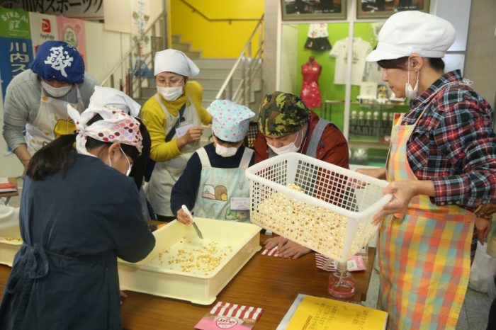 ハンディキャップのあるスタッフと一緒に、ポップコーンの製造と袋詰めをし、商品を完成させます。