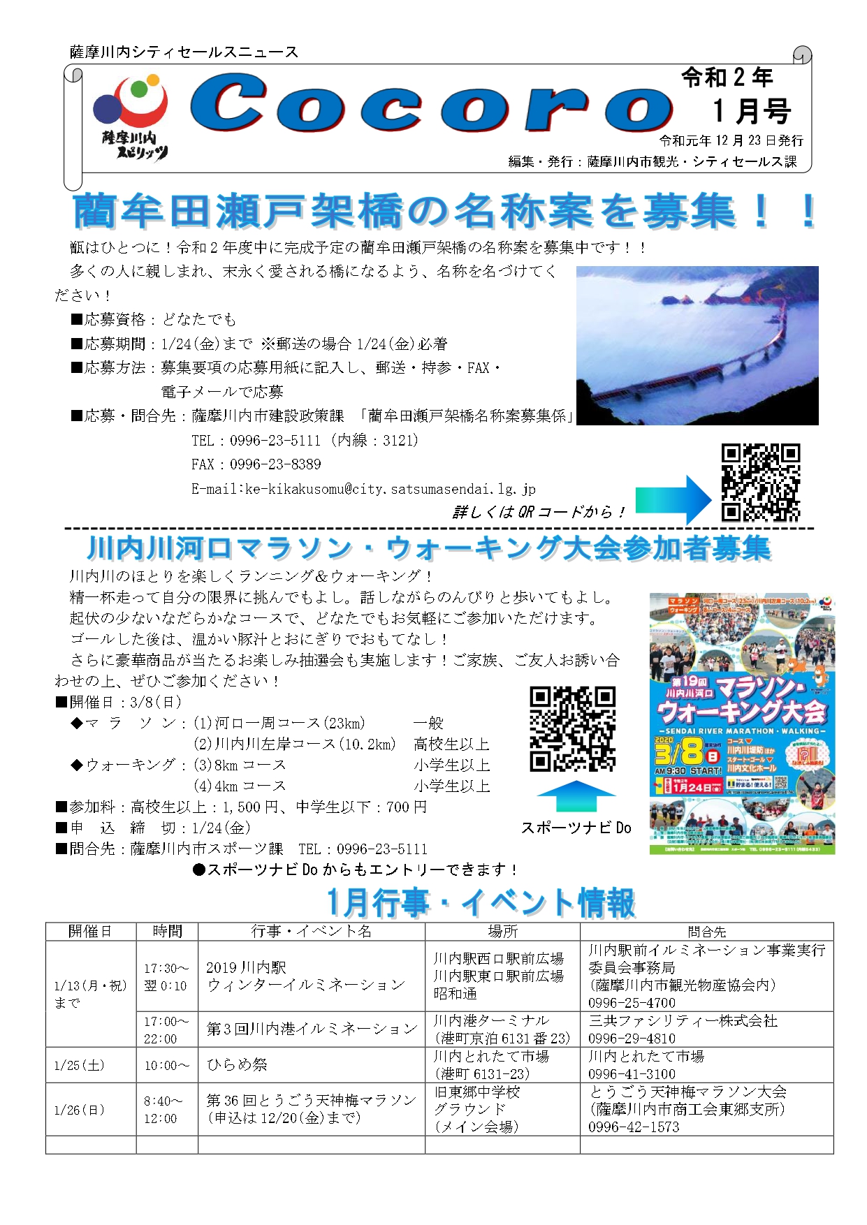 「月刊 薩摩川内シティセールスニュース Cocoro 令和2年1月号」が発行されました。
