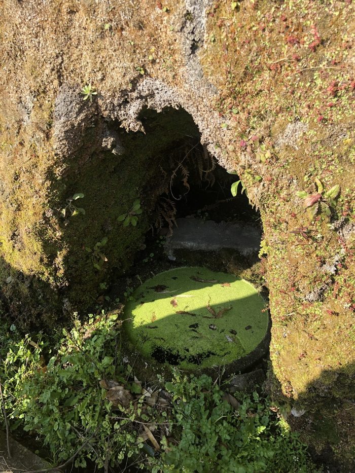 船瀬殿墓付近にも見られる水貯め所。山城はシラス地層の上に建っており、麓の町ではその地層から染み出す水を生活用水に使っていました。