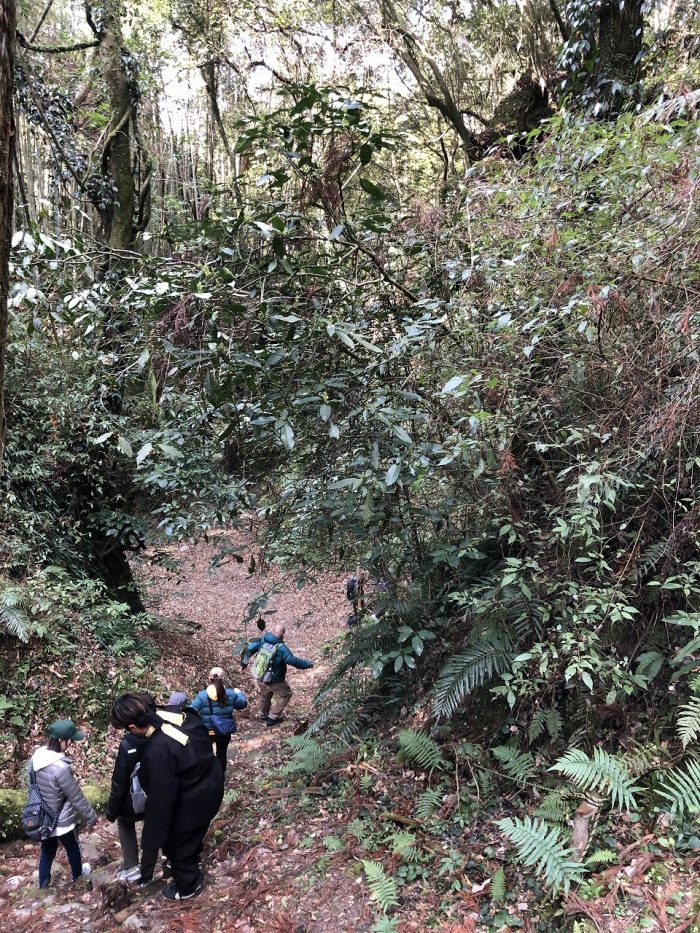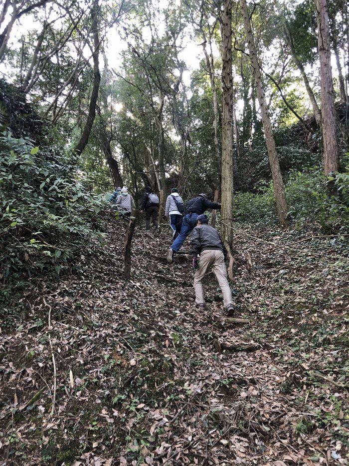 堀切を抜けると、明るい景色が広がります。人里に出てきました。ゆっくり登って、3か所ほど立ち止まり説明を聞いて。1時間ほどの山歩きでした。