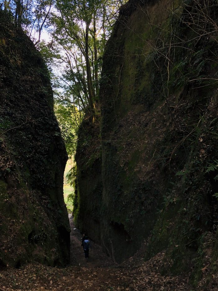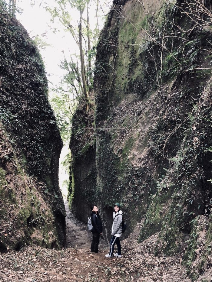 山城最大の見どころ、堀切(切通)へとやって来ました!シラス地層を人工的に削って造られたもので、人がひとり、ふたりギリギリ通れるくらいの道幅です。その高さ、狭さに圧倒されます。