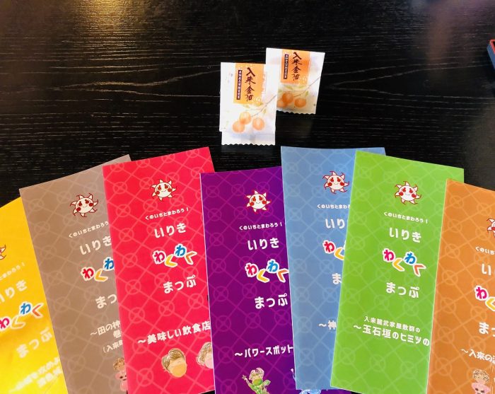 入来名物、金柑を使ったお菓子と「いりきわくわくまっぷ」。温泉、飲食店、山城攻略、滝案内、玉石垣のヒミツ、パワースポット、田の神さあと、入来麓をディープに楽しめるバラエティ豊かなマップが完成しました。入来麓観光案内所をはじめ、市内各地で配布中です。これを手に、ぜひ知る人ぞ知る場所を訪れてみて。