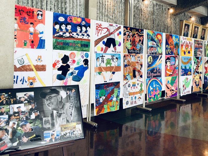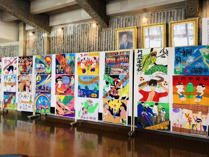川内文化ホールロビーに展示された市内の小中学生の皆さんが描いた応援ポスターです。佐々部監督と共に、完成披露を見守りました。