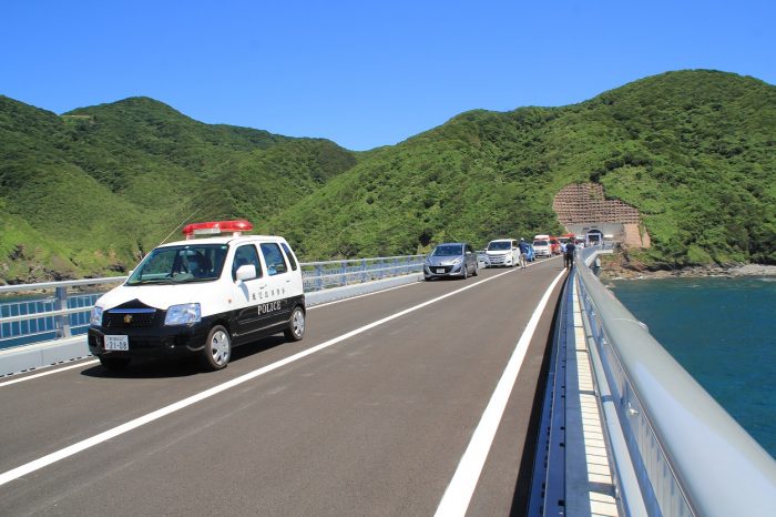 開通5分前!既に甑大橋を渡ろうとしている車やバイクがあり、中にはロードバイク(自転車)の姿も!