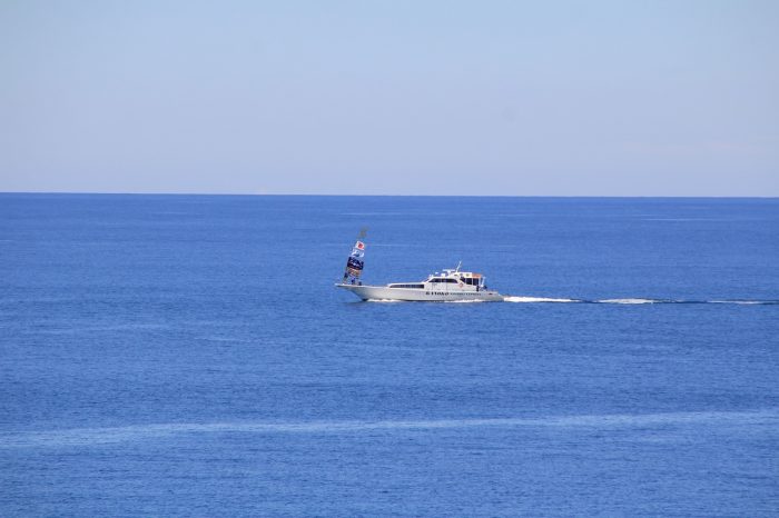 撮影をしていると明日の漁船パレードの旗艦を務める観光船かのこが試運転を行いに甑大橋周辺にやってきました。