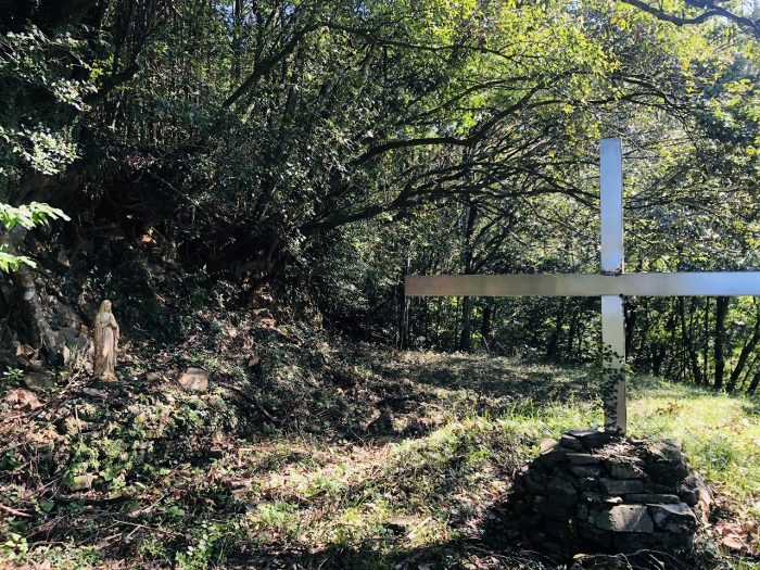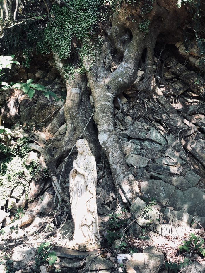 大木の根に守られるように、そっとたたずむマリア像。