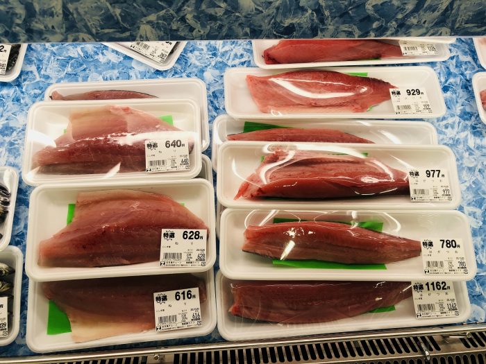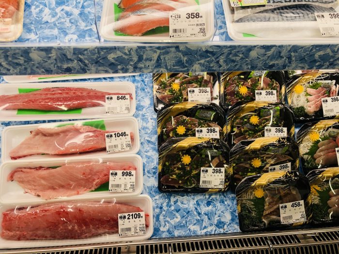お礼を言って、たかえびを手に作業場を後にする。宿に戻る途中、地元の小さなスーパーに立ち寄ってみた。新鮮な魚がお刺身で売られている。ねり(ねりご、ともいう。かんぱちの子)、はがつお。