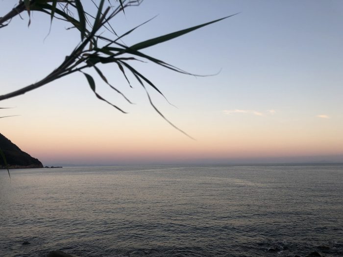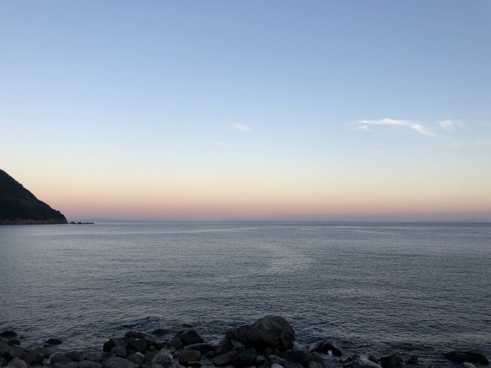 ここからしばらく海の夕焼けを眺めていた。なんともいえない淡い色彩のグラデーション。
