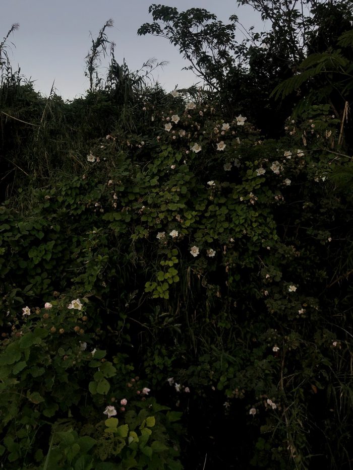 海岸沿いに咲く芙蓉。宵闇に星のように白く浮かびあがった。